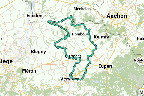 Inicio/final: de Zegelskoel, Heijenratherweg 22, Heijenrath. Ascensos: Ascensos: Schilberg Slenaken 900 m., máx. 12.0%. Magnebos Veurs (B) 2.200 m., máx. 9.0%. Holliquette Val-Dieu (B) 1.300 m., máx. 8.0%. Les Trixhes Froidthier (B) 900 m., máx. 9.0%. Chantraine (parcialmente) Clermont (B) 500 m., máx. 6.0%. Halleux Halleux (B) 900 m., máx. 9.0%. Rue Joseph Wouters Honthem (B) 1.100 m., máx. 9.0%. Rue de Beusdael Sippenaeken (B) 2.800 m., máx. 8.0%. En la ruta también hay varios ascensos sin nombre. Metros de altitud: 1.295. Parada para café: Taverne du Perron, Rue du Perron 1 Stembert (B). Abierto desde las 11.00 horas (cerrado los martes).