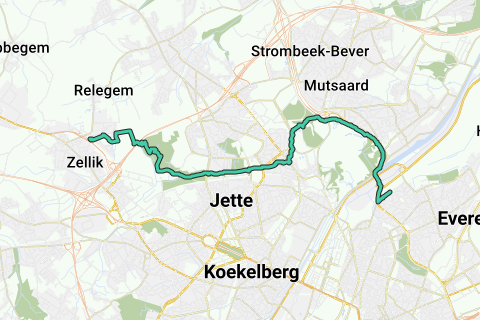 Desde la Estación Schaarbeek hasta la Estación Zellik. Se ha seguido en su mayor parte la ruta de groenewandeling.be alrededor de Bruselas.