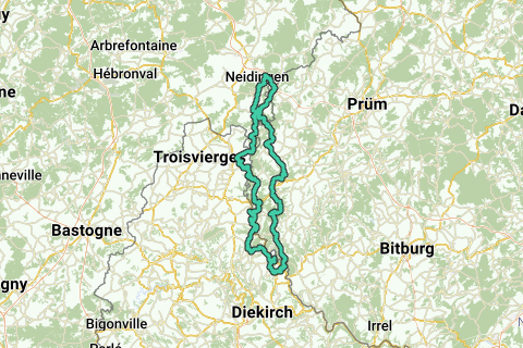 Dreihütten – Steinesbrück – Elcherath – Auel – Steffenhausen – Auf Halenfeld – Lützkampen – Harspelt – Roscheid – Eschfeld – Wässerchen – Reiff – Irrhausen – Bermischthof – Daleiden – Falkenauel – Machtemesmühle – Sevenig bei Neuerberg – Dauwelshausen – Rodershausen – Bauler – Gaalgebierg – Vianden – Bivels – Lamescht – Keppeshausen – Stolzenbourg – Purpelescht – Weiler – Ackerscheid – Wahlhausen – Untereisenbach – Übereisenbach – Eisenbach – Obereisenbach – Kounenhaff – Preischeid – Dasburg – Hohe Kuppe – Stephanshof – Dahnen – Tentismühle – Kazeknapp – Kalhorn – Lieler – Bierg – Ouren – Peterskirchen – Oberhausen – Stoubach – Burg-Reuland – Bracht – Maspelt – Lommerweiler – Dreihütten.