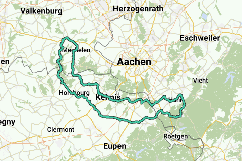 Recorrido Gulpen-Mulartshütte-Gulpen. Inicio/fin: Marktstraat/Rijksweg Gulpen. Ascensos: Roodweg Epen 400 m., máx. 8.0%. Smidsberg Epen 1.500 m., máx. 7.0%. Rue de Lattenheuer Plombières (B) 1.100 m., máx. 9.0%. Belle-Vue Plombières (B) 1.200 m., máx. 10.0%. Rue de Viaduc Moresnet (B) 600 m., máx. 9.0%. Bachstrasse Kelmis (B) 700 m., máx. 12.0%. Buschhausstrasse (parcialmente) Hauset (B) 450 m., máx. 5.0%. Freyenter Wald Lichtenbusch (B) 600 m., máx. 8.0%. Aachener Strasse Walheim (D) 800 m., máx. 9.0%. Mulartshütter Strasse Venwegen (D) 1.900 m., máx. 8.0%. Quiriniusstrasse (parcialmente) Rott (D) 900 m., máx. 9.0%. Rottendell Rott (D) 600 m., máx. 12.0%. Rue de Hombourgh Montzen (B) 2.100 m., máx. 7.0%. Gieveld Teuven (B) 1.500 m., máx. 6.0%. Metros de altitud: 996. Parada para café: restaurante Birkenhof, Mulartshütter Strasse 20, Stolberg-Venwegen (D) (lun. cerrado)