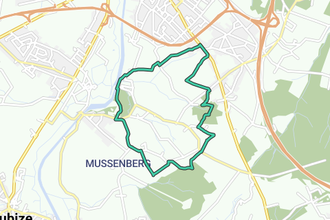 De Van Broek 1, 1500 Halle (estacionamiento del antiguo Lidl) al canal Bruselas-Charleroi, a través de la pradera de la torre Malakoff, el hermoso Botermelkweg y el bosque de Maasdal, de regreso al inicio.
