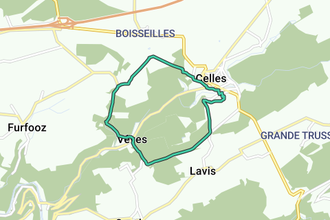 Una hermosa caminata fantástica hacia el castillo de Vêves que se puede visitar. Después puedes elegir si tomas la ruta corta de regreso a Celles o si sigues la ruta larga hacia la izquierda. Es una caminata con mucho falso plano.