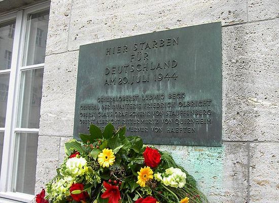 El visitante entra al museo de Stauffenbergstrasse través de un arco, en la pared de la cual se inscribe:. "Aquí, en el ex Cuartel General Supremo del Ejército. Alemanes organizaron el intento de poner fin a las injusticias del régimen nazi el ¨20 de julio de 1944. Para ello, sacrificaron sus vidas. La República Federal de Alemania y el Estado de Berlín crearon este nuevo monumento en 1980". El visitante entra en el patio central, en él se ubica una estatua de un hombre desnudo, dicha estatua marca el lugar donde los conspiradores fueron ejecutados. Una placa en una pared cercana conmemora este acontecimiento. Delante de la estatua, incrustado en el suelo, una placa dice en alemán:[2][3]