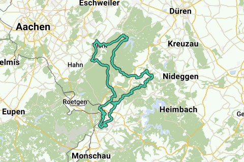 Descubre todas las ventajasLa ruta comienza cerca del wanderparkplatz de Breinigerberg (entre los pueblos de Breinigerberg y Vicht). Esto no está lejos de Aquisgrán y es relativamente rápido de alcanzar desde, por ejemplo, los Países Bajos. Desde aquí, ya estás listo para disfrutar de deliciosos caminos de grava por la parte norte de la Eifel, en Hürtgenwald y a lo largo del río Kall. El 62% de la ruta consiste principalmente en buenos caminos de grava.
