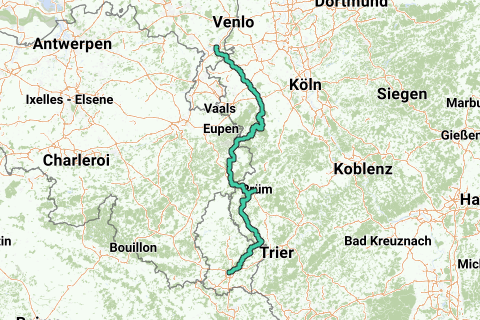 Descubre todas las ventajasEsta ruta ciclista de 340 km de longitud por el oeste de Eifel conecta Roermond y Luxemburgo. La ruta pasa por los Países Bajos, Alemania, Bélgica y Luxemburgo y combina diversas rutas ciclistas existentes a lo largo de ferrocarriles desactivados (Vennbahn y Eifel-Ardennes-Radweg) y valles fluviales (RurUfer y Prüm-Radweg)