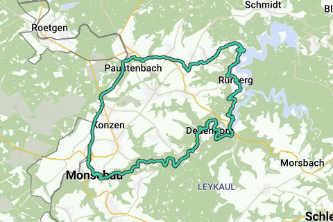 Ruta realizada durante un viaje en bicicleta de 3 días en Monschau, mayo de 2023. Día 3 de las vacaciones en bicicleta, partimos del aparcamiento del centro Austraße (aparcamiento de pago), justo al lado del Rur donde comienza el recorrido. El trayecto transcurre a lo largo del serpenteante Rur por un camino de grava hasta llegar al Rursee en Einruhr, luego sube hacia Rurberg (algunos bonitos cafés junto al Rursee). El camino de vuelta es aquí y allá sin pavimentar y bastante empinado, así que presta atención. La mayoría de las carreteras son bastante tranquilas en cuanto a tráfico, hasta volver a la Vennbahn para luego adentrarse en Monschau.