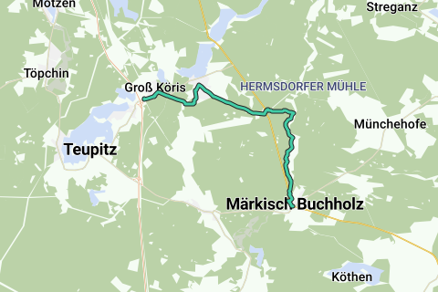 Estación de tren Groß Köris - a la izquierda Berliner Straße - a la derecha camino peatonal junto a la carretera en dirección a Klein Köris - triángulo Löpten con área de descanso - cruzar la carretera hacia Löpten y entrar en el camino del bosque - claro del bosque al final a la izquierda - antes del área de camping a la izquierda hacia Klein Köris - En la ladera - a la derecha Bergstraße - Hammerstraße - cruzar la B 179 - hacia la casa forestal Hammer - área de descanso en la casa forestal Hammer - camino del bosque recto - después de aprox. 1 km Dahme - a la derecha camino cerca de la costa aprox. 6 km hacia Märkisch Buchholz - Märkisch Buchholz, mercado con iglesia