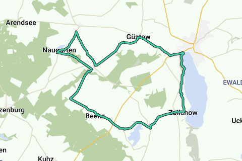 Recorrido: Prenzlau, Röpersdorf, Zollchow, Lindenhagen, Beenz, Kröchlendorff, Gollmitz, (opcional: desvío al lago de baño en Naugarten), Güstow, Prenzlau