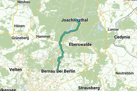 El sendero de 53 kilómetros se extiende desde Bernau siguiendo el camino ciclístico Berlín-Usedom. Sin embargo, en parte, la ruta se desvía del camino ciclístico para permitir a los excursionistas etapas sin ciclistas. Longitud: 53 km (2-3 días) Inicio: Bernau cerca de Berlín Destino: Joachimsthal Logotipo / señalización del camino: barra roja sobre fondo blanco Acceso: Tren: Desde la estación central de Berlín con el RE3 (Schwedt) hasta Bernau (aproximadamente 20 minutos). Coche: Desde Berlín por la A114, A10 y A11 hasta Bernau (aproximadamente 30 minutos). Trayectoria: Bernau, Biesenthal, Marienwerder, orilla sur del lago Werbellinsee, Joachimsthal Atractivos: Bernau: casco antiguo medieval, murallas, museo local Joachimsthal: estación del emperador, iglesia de Schinkel Posibilidades de combinación 66-Ruta de senderismo de lagos Excursión a lo largo de la orilla del lago Werbellinsee Estado del camino / desarrollo de la ruta: sin datos Cartas / literatura: "Barnimer Feldmark und Naturpark Barnim: mapa topográfico de ocio", 1:30000, medición estatal e información geoespacial de Brandeburgo (1 de enero de 2012), ISBN-13: 978-3749041572, 6,- euros "Schorfheide - Uckermark - Barnim: mapa de senderismo con guía de actividades y rutas para bicicletas", 1:50.000, mapas KOMPASS, edición: 2 (1 de febrero de 2015), ISBN-13: 978-3850265393, 9,95 euros