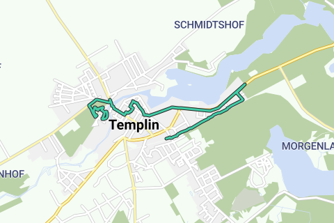 Recorrido: Estación de tren Templin Stadt - Jardín Lehmann en el antiguo Gimnasio Joachimsthal - MKC - Museo de Historia de la Ciudad - Murallas de la ciudad hasta la Puerta de la Escuela - Iglesia de Santa María Magdalena - Puerta del Molino - Parque de los Ciudadanos - Ayuntamiento con Plaza de Mercado - Puerta de Berlín - Zona Wellness - NaturThermeTemplin - Bosque de Buchheide - Playa de Lübbesee - Estación de tren Templin Stadt