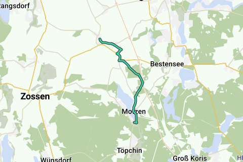 Motzen, parada de autobús Fontaneklinik - a la derecha Töpchiner Straße - Karl-Marx-Straße - iglesia con el olmo de campanas y viejos moreros - (acceso al lago de Motzen) - Casa de los Huéspedes de Motzen - calle Mittenwalder - a la derecha Birkenwäldchen - Am Tonsee - a la izquierda Am Tonsee - poco antes de la calle Mittenwalder a la derecha camino forestal y de campo - mantener a la izquierda en la A13 - a la izquierda camino forestal y de campo hacia Gallun - a la izquierda Storkower Straße - a la derecha Mittenwalder Chaussee - B 246 - a la derecha en el camino agrícola - a la izquierda en la intersección - sobre el Königsgraben - a lo largo del tren de drásina - a la derecha Schenkendorfer Chaussee - continuar por Rathauschaussee - junto a los bomberos.