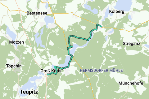 Parada de autobús Prieros Dorf (Storkower Allee) - Puente sobre el Dahme - girar a la izquierda en An der Dubrow (dirección camping) - mantener a la izquierda cerca de la orilla del Dahme - hasta el centro de ocio infantil y juvenil KJF - camino de bosque a la derecha - detrás del área KJF, izquierda hacia la orilla del lago Schmöldesee - área de descanso y baño Campingplatz D66 "Huschte See" - camino de orilla en Schmöldesee a través del camping con área de descanso y baño - después de aprox. 2 km a lo largo del camino de orilla, a la derecha un camino de bosque hacia la casa del bosque Dubrow, mantener a la izquierda solo allí - en parte caminos de orilla en Förstersee y Hölzernen See - KiEZ Hölzerner See con áreas de descanso en Hölzernen See - camino hacia Hölzernen See - girar a la izquierda en B 179 hacia Neubrück - camino peatonal sobre el puente Hölzerner See / Klein Köriser See - parada de autobús Neubrück - derecha hacia la orilla Klein Köriser See - mantener a la derecha cerca de la orilla hacia Klein Köris - Neubrücker Straße - girar a la derecha en Chausseestraße - camino para bicicletas hacia Groß Köris - Berliner Straße - estación de tren Groß Köris
