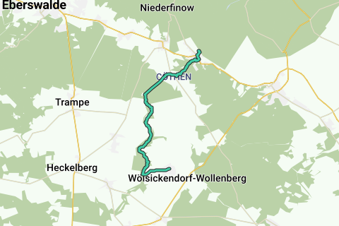 Logo / Señal de ruta: punto rojo sobre fondo blanco Acceso: Desde la estación principal de Berlín con el RE3 (Stralsund) hasta Eberswalde. Desde aquí, continuar con el RB60 (Frankfurt / Oder) hasta Falkenberg (aprox. 1,5h). Salida: Desde Wölsickendorf en el autobús 887 hasta Werneuchen. Desde aquí, continuar con el RB319 hasta la estación de trenes de Berlín Ostbahnhof (aprox. 1h). Recorrido: Falkenberg, Cöthen, Wölsickendorf Descripción del camino: