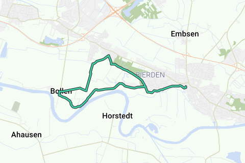 La ruta de senderismo comienza en el "barrio campesino de Achim" (1) junto a la iglesia de St. Laurentius (2). En el aparcamiento de la iglesia encontrará el primer cartel del sendero. Ahora baje por las escaleras en dirección sur por la "Pequeña calle de la iglesia" y gire a la derecha en la "Calle Inferior" (3). Siga esta calle hasta llegar a la calle "Am Werder" (4), en la que entonces girará a la izquierda. Desde la duna, por la que ahora puede caminar, tiene una vista que merece la pena de la marcha de Achim. Sin darse cuenta, ahora ha llegado al distrito de Bierden (5). Detrás de la posada "Zur Linde", gire a la izquierda en la calle "Bierdener Marsch". Luego, continúe a la derecha detrás del paso de la duna (paso de la duna). Siga el camino hasta que la duna cruce su camino. A partir de aquí, el sendero de senderismo puede continuar como usted prefiera sobre la duna (6) o por la carretera que corre a lo largo de la duna en dirección a Clüverswerder. En los numerosos bancos, puede disfrutar tranquilamente de la vista sobre la marcha de Bierden (7) y sobre el Weser. También aquí la marcha forma parte del área de protección del paisaje Clüverswerder (8), que se extiende desde Verden-Eissel a lo largo del Weser hasta el área de Bremen. El camino continúa pasando por la planta de tratamiento de aguas residuales de Achim (en funcionamiento desde 1965) hasta el lugar donde la calle que va junto a la duna se bifurca a la derecha. Allí encontrará una cabaña de refugio debajo de la duna. En este punto, manténgase a la izquierda y siga caminando junto a la duna. Después de unos metros, a su derecha, encontrará un lago rodeado de altos árboles. A través de los árboles se puede vislumbrar la finca Clüverswerder (9). El camino continúa ahora sobre la cumbre de la duna. Pasando por el área pantanosa "Pannen" (10), la duna se acerca a unos pocos metros del río Weser. Desde aquí se puede observar muy bien el tráfico de barcos en el Weser. Con el camping también se ha llegado al distrito de Bollen (11). Desde aquí puede elegir si desea caminar sobre el suave suelo de la duna o por la carretera asfaltada. En el paso de la duna, debería detenerse un momento y dejar vagar la vista sobre la marcha. Son llamativas las muchas turbinas eólicas en el horizonte.