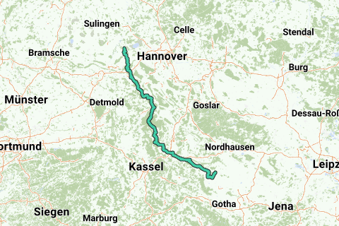 A lo largo de aproximadamente 300 km, el camino sigue los ríos Weser, Leine y Unstrut.