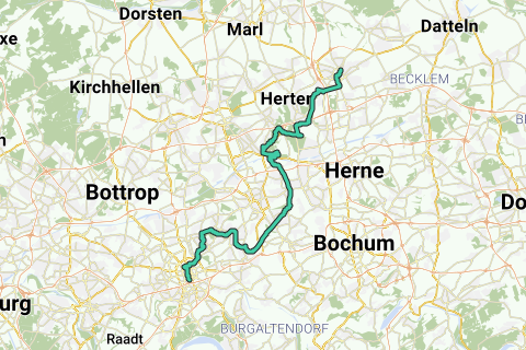 Desde la estación central, el recorrido lleva primero directamente a través del centro de Essen hacia el norte. A partir del punto de conexión 57 en el barrio universitario, la ruta continúa por calles pequeñas y pasa por una colonia de jardinería hacia el Patrimonio de la Humanidad de la UNESCO Zollverein.