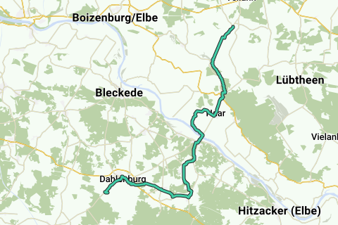 Comienza en la estación de tren de Brahlstorfer hacia Storkenkate en Preten, continúa hacia Neuhaus pasando por Haar hasta el pueblo de marchas Konau con el centro Arca de la oficina de Neuhaus y la información turística, así como un recorrido sobre la historia de la frontera y la torre de la frontera, cruza el dique hacia Darchau, cruza con la transbordadora Tanja, continúa hacia Ventschau y uno de los mayores bolos aquí, luego hacia Nahrendorf al museo, destino estación de tren de Dahlenburg.