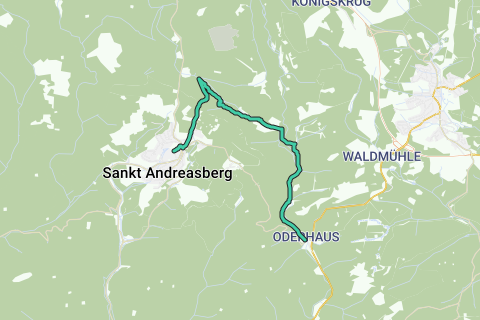 Desde el Kurhaus Sankt Andreasberg hacia arriba por la Clausthaler-Straße y luego a la derecha, bajando por la Braunlager-Straße. Luego, la primera calle “Am Gesehr” a la izquierda hacia arriba y continuar recto hacia la Jordanshöhe. Entre la casa de los amigos de la naturaleza (a la izquierda) y la cabaña Eichsfelder (a la derecha) baja hacia el Rehberger Graben en dirección a la casa del Rehberger Graben. En el primer cruce, se sigue la señalización "Rinderstall" hacia abajo. A través de la Lochchaussee se transita con una ligera pendiente por un paisaje forestal único de Harz hasta la Odertalstraße, que se sigue a la derecha hasta el Rinderstall. Aquí se puede disfrutar de una hermosa fogata de trineo en buenas condiciones de nieve (aproximadamente 3 km de descenso) o seguir caminando hacia Oderhaus en dirección a la administración del parque nacional. Después de la caminata de aproximadamente 8 km, se puede tomar cómodamente el autobús de regreso a Sankt Andreasberg desde Oderhaus.