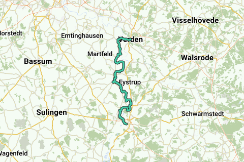 Desde Nienburg, el sendero ciclista del Weser le lleva al puerto a través del puente Weser hasta Drakenburg. Pasando por el embarcadero de barcos, el viaje continúa hacia Drakenburg a través de Marklohe. En Drakenburg, el antiguo pueblo con el arco de la renacimiento de Weser y la iglesia de San Juan Bautista es de gran importancia. El viaje sigue cerca del Weser en dirección a Eystrup y Hoya. A través del ferry Weser Schweringen-Gandesbergen, la ruta vuelve al lado izquierdo del Weser y pasa por Bücken, Hoya y Dörverden. En Döverden, la iglesia y el molino de viento de galería de Hollanda son atractivos. Siguiendo por la izquierda del Weser, continúa en bicicleta a través de Magelsen y Oiste hasta su destino de etapa, la ciudad de jinetes Verden.
