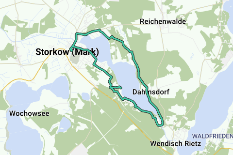 Recorrido: Castillo de Storkow, Playa Karlslust, Despensa de Netti, Castillo Hubertushöhe, Iglesia Católica, Puente de Ovejas, Wendisch Rietz, Dahmsdorf, Wolfswinkel, Calle Reichenwalder, Viejo Viñedo, Playa, Puente levadizo, Ciudad Vieja, Castillo de Storkow