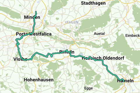 Justo al comienzo de la tercera etapa, hay un hito cultural e histórico con la ciudad de Hameln, famosa por el flautista. El casco antiguo histórico de Hameln destaca por sus casas de entramado de madera restauradas, callejones pequeños y muchas referencias a la leyenda del flautista. En la orilla izquierda del Weser, el recorrido va parcialmente por la carretera rural y a través de hermosos paisajes naturales a lo largo del Weser, pasando por Haverbeck, Lachem hasta justo antes de Fuhlen, donde cruzará la orilla del Weser. Aquí puede hacer una pequeña excursión a Hessisch Oldendorf, al pueblo de Münchhausen, una de las mayores fortificaciones urbanas de la nobleza schaumburguesa. A continuación, la ruta lo llevará a lo largo del Weser, pintoresca, hasta Großenwieden. Aquí será transportado a la otra orilla del Weser por un ferry de cable que aprovecha la corriente del río. Pasando por la naranjería de Exten, llegará a la antigua ciudad universitaria y fortificada de Rinteln. Los destinos populares son las visitas guiadas históricas, el Museo Eulenberg y el jardín cervecero Erlebnisbiergarten Weserdorf. De vuelta en la orilla izquierda del Weser, pasará por muchos lagos, el castillo de Vlotho hasta Porta Westfalica. Más al norte, después de casi 70 kilómetros, llegará a la ciudad de Minden con sus diversos estilos arquitectónicos y conocidas instituciones culturales.