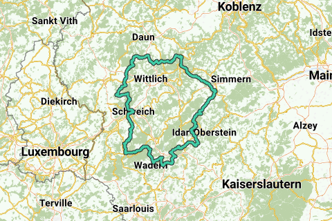 El tour comienza cerca de los Motorhotels Am Vulkanberg y Am Ceresplatz, en el centro de Manderscheid. Conducimos a través de Bad Bertrich hacia el Mosela (agradable descenso) y lo seguimos durante un tiempo. Cuando cruzamos el Mosela, llegamos al hermoso Hunsrück. Cerca de Trier, regresamos a la Eifel a través del Mosela.