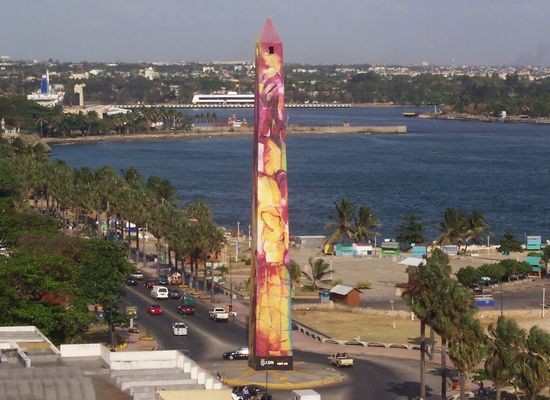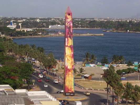 Obeliso de 40 metros de altura. Diseñado en 1936 por Alfredo Gonzalez Sanchez y construido por el ingeniero Rafael Garcia Bonnelly. la obra fue inaugurada el 11 de enero de 1937. El contexto de su onstruccion fue para celebrar el cambio de nombre de la ciudad Santo Domingo a Ciudad Trujillo; ha permanecido hasta nuestros dias a pesar de que en su momento, se destruyeran edificios y estatuas que rendian culto a la dictadura de Trujillo, al final de esta.