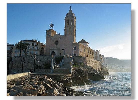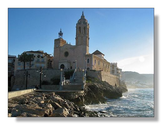La iglesia de San Bartolomé y Santa Tecla es la parroquial de la ciudad de Sitges, edificada en el siglo XVII con numerosas modificaciones posteriores. Su silueta asimétrica, sobre una colina que preside la playa, es una de la imágenes más características de la villa de Sitges.Se trata de un templo barroco de tres naves con bóveda de medio punto reforzada por nervaduras. Esta iglesia es del siglo XVII, y se sitúa en el mismo lugar que ya había acogido dos iglesias anteriores, una románica y otra gótica (del 1322), poco documentadas por la pérdida de la documentación anterior al siglo XVII. La construcción se inició en 1665 y la iglesia fue bendecida el 18 de julio de 1672. Uno de los dos campanarios, la «torre del comunidor», es dos años posterior, en 1868 se pusieron las campanas y el reloj de la villa, una vez derribada la antigua «torre de las horas» de la calle mayor. En el siglo XIX se hicieron nuevamente obras de importancia: entre 1854 y 1856 se construyó la capilla del Santísimo y en 1868 se reformó el segundo campanario, de planta octogonal.