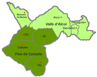 Su capital histórica es Castalla y el núcleo más poblado es Ibi. Comprende el curso alto del Río Verde o Monnegre, que riega la Huerta de Alicante.