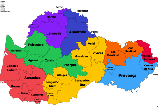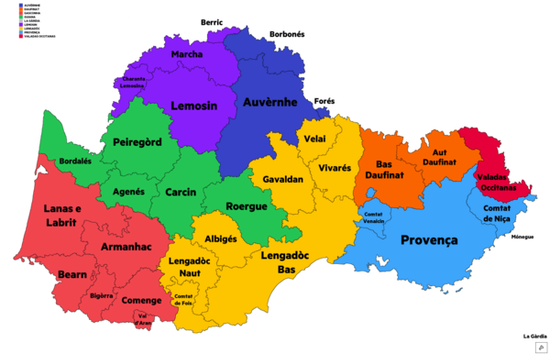 Corresponde en su mayor extensión con el Mediodía francés, aunque comprende también el Valle de Arán, situado en la cordillera de los Pirineos , y algunos valles alpinos llamados Valles Occitanos, pertenecientes a la región italiana del Piamonte, así como el Principado de Mónaco.