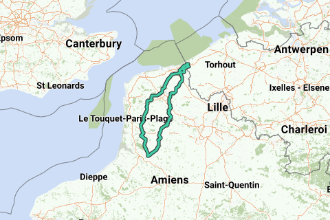 Ruta circular desde De Panne Adinkerke a través de Arques y Auxi-le-Château hasta Saint-Riquier. Regreso por Hucqueliers, Watten y Bergues. Desde Adinkerke a través de Uxem, Wormhout, Nordpeene y Clairmarais hasta Arques. Más allá de Blendecques, Mametz, Ouoeux-Haut-Maînil y Auxi-le-Château hasta Saint-Riquier. Regreso por Crécy-en-Ponthieu, Brimeux, Clenleu, Coulomby y Moringhem hasta Watten. A lo largo del canal de la Haute Colme a través de Lynck y Millebrugghe hasta Bergues. A lo largo del canal de la Basse Colme a través de Benkies Mille y Haverskeete hacia los Moeren y regreso hasta Adinkerke.