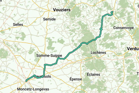 Etapa (99 km) de la ruta en bicicleta "A lo largo de viejos caminos y ciudades de peregrinos". La etapa va de Dun-sur-Meuse a Châlons-en-Champagne.