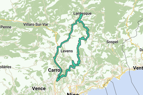 Finalmente, saldrás del valle a través del Col de la Porte (en un hermoso entorno montañoso). Después, es cuesta abajo y finalmente es un sube y baja hacia el hermoso pueblito de Coaraze. Después de Coaraze, pedaleas hacia Bendejun y subes por caminos locales hacia Chateauneuf-Villevieille. Luego viene el Col d'Aspremont (unos 160 metros de diferencia de altura) y pasas por el precioso lugar de Aspremont. En Aspremont, debes disfrutar de la vista sobre el valle del Var. Luego son unos 12 km de descenso y, lamentablemente, debes seguir la muy transitada carretera principal oriental en el Vardal a lo largo de un kilómetro.