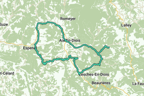Desde Die (Hôtel des Alpes) en el Pays Diois, primero pedaleas río arriba en el valle del río Drôme (con una pequeña subida) y luego te diriges hacia la cuenca del río Le Bès, que sigues río arriba. En el desvío hacia Col de Miscon hay un recorrido de ida y vuelta incluido en la ruta (de un total de 12 km): el camino por Gorges des Gats: un hermoso desfiladero donde también pasas junto a una cascada. Se sube aproximadamente 70 metros de altitud en este desfiladero, que luego desciendes. A continuación, llega el Col de Miscon con un túnel sin iluminación (y un 10% de pendiente) al principio, y se abandona el valle del Bès. La subida es muy tranquila en cuanto al tráfico (casi ningún coche y pasa por un paisaje idílico). El descenso (que es bastante desafiante) te lleva de nuevo al valle del Drôme, que ahora sigues río abajo y también ves un fenómeno geológico llamado Chaos rocheux du Claps. Se abandona el valle del Drôme por el lado oeste para ascender el Col de Pennes, en el macizo montañoso de La Pâle. El macizo de La Pâle es una región deshabitada, la comida solo se puede encontrar en el pequeño pueblo de Pennes-le-Sec (o de antemano en Recoubeau). Después del descenso (que es empinado, con una pendiente media del 9%), pedaleas río abajo a través del valle de la Roanne, con un carácter a veces de desfiladero (Gorges de l'Escharis). La última parte de la ruta sigue la carretera principal a través del valle del Drôme de regreso a Die.