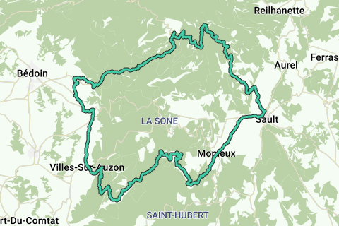 Ronda picante desde Villes-sur-Auzon hacia Fassan. Luego se asciende con el Ventoux hasta Chalet Reynard; a continuación, se desciende hacia Sault y a través de las Gorges de la Nesque se regresa a Villes-sur-Auzon. Salida y llegada en el camping municipal de Villes-sur-Auzon. La distancia es de 67 km, con 1700 metros de desnivel. Solo caminos asfaltados.