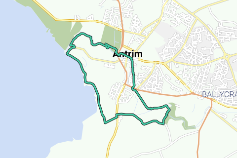 Comenzando en el Parque de la orilla del lago Antrim, sigue el camino hacia el sur a través del bosque de Rea, luego viaja hacia el interior por Kirby's Lane hasta que llegues al río Six Mile Water. Aquí un camino te lleva de regreso a Antrim a lo largo de una sección del Mill Race Trail. Cicla a través de la ciudad hasta la Puerta Barbican, luego gira a la izquierda hacia los Jardines del Castillo de Antrim, pasando por el Motte en ruta hacia Clotworthy House. Cruza el río en el Puente Deer Park y sigue el camino junto al río de regreso al lago.