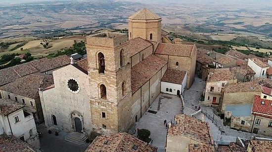 La catedral actual se edificó entre el siglo XI y el siglo XIII, sobre las ruinas de una iglesia paleocristiana precedente, que se levantaba sobre lo que quedaba de un templo antiguo de época romana dedicado a Ercole Acheruntino.