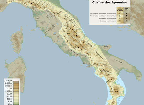 Los montes Apeninos recorren 1400 kilómetros del norte al sur de Italia y forman el eje principal de la península itálica o apenina, desde el golfo de Liguria hasta la península de Calabria. Las montañas están mayoritariamente cubiertas de bosques, aunque una cara del pico más alto, el Gran Sasso d'Italia, de 2914 metros, está parcialmente cubierta en su cara norte por el que es el glaciar más meridional de Europa desde que se derritió el glaciar del Veleta, en Sierra Nevada, a principios de siglo XX Las laderas orientales que miran al mar Adriático son escarpadas mientras la zona occidental termina en llanuras donde están situadas la mayoría de las ciudades históricas italianas.