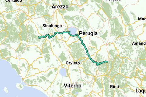 A través del Val d'Orcia de Toscana hacia Umbría, pasando por pueblos sobre colinas como San Quirico con sus cipreses, Pienza con paisajes protegidos por la UNESCO, Montechiello y Montepulciano. Una vez en el lago di Trasimeno, es pura diversión conducir serpenteando hacia Mugnano, Marsciano. A lo largo del antiguo Todi y luego de nuevo el paso hasta Spoleto.