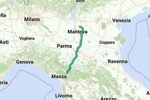 Del hotel Corte Castelletto en Via 9 Maggio, 37060 Pradelle, Veneto, Italia hasta el Agriturismo Ai Frati a lo largo de la Via la Piella, 55032 Castelnuovo di Garfagnana, Toscana, Italia