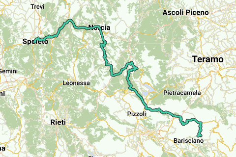 A lo largo de cientos de curvas, a menudo a gran altura, se sale del hotel boutique Aurora, Via dell'Apollinare 3, 06049 Spoleto PG, Italia, para abandonar Umbría y terminar en el verdaderamente idílico Santo Stefano di Sessanio, Abruzzo, Italia. Un pueblo medieval que se encuentra a 1250 metros en el Parco Nazionale Gran Sasso e Monti della Laga. La amplia belleza natural en el camino, pero sin duda también las huellas aún visibles del terremoto de 2009 te hacen sentir humilde.