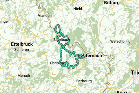 Descubre todas las ventajasLa ruta comienza desde el aparcamiento de la estación de autobuses en Reisdorf, pero también puedes aparcar cerca de la iglesia de Reisdorf. Es casi 3,4 km de subida hacia Beaufort, con algunas vistas impresionantes del valle del Sauer en el camino. En Beaufort pasas por la gran ruina del castillo, seguida de un corto ascenso. Desciendes a un valle fluvial y subes hacia Haller. Después de Haller, desciendes al valle de la Zwarte Ernz, pasando por algunas formaciones rocosas. Ahora te encuentras en Pequeña Suiza, en el Müllerthal. Pedaleas por este valle junto a una cascada, esta parte de Luxemburgo es muy turística y, por lo tanto, puede estar bastante concurrida en temporada alta en este camino. Subes fuera del valle de la Zwarte Ernz (Müllerthal) por el Rue de Müllerthal, y luego pedaleas hacia Consdorf dando un rodeo a través de Breidweiler y, en el camino, pasas por varias formaciones rocosas.