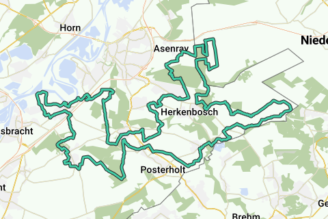- pero sobre todo, pedaleas a través de muchas áreas naturales (los bosques cerca de Montfort (Finca Rozendaal), el valle de Roer, las extensas zonas boscosas y de brezos del Parque Nacional Meinweg, área natural Luzenkamp y el adyacente Elmpterwald montañoso en Alemania con kilómetros de caminos de grava, y el Munnichsbosch).