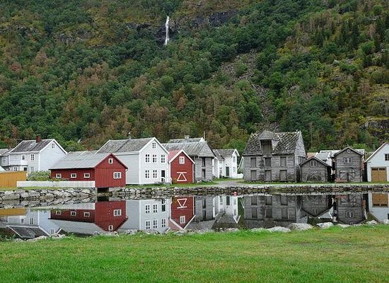 El valle de Lærdal es largo, y va desde Hemsedal y el monte Filefjell al este al Sognefjord en el oeste. Alrededor de 1200 habitantes viven en el pueblo de Lærdalsøyri; el resto en Borgund, Ljøsne, Tønjum, Erdal, Vindedalen, Ytre Frønningen y Strendene. El antiguo pueblo de Lærdalsøyri tiene 161 edificios protegidos. Algunas de las casas se remontan a mediados del siglo XVIII.