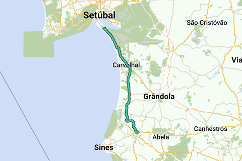 La segunda etapa tiene 62 km de largo. Después de cruzar en ferry desde Setúbal, la ruta va de Tróia a Santiago do Cacém. La primera parte transcurre por un paisaje llano y arenoso, más tarde se vuelve más montañoso con una seria subida en los últimos 5 km hacia Santiago.
