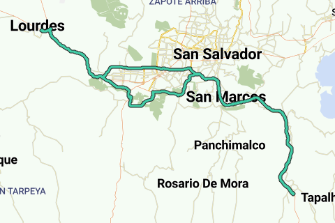 Salimos de Lourdes, sobre la carretera de los chorros, para luego tomar el bulevar sur, hasta el centro comercial la Joya, para retornar y tomar el bulevar de Nuevo Cuscatlan hasta Santa Elena, sobre el bulevar Orden De Malta, nos dirigimos al bulevar Luis Poma, pasando por la Cima, hasta llegar a la carretera de Comalapa, de ahí nos vamos por toda la carretera hasta llegar a Olocuilta, de ahí retornamos por toda la carretera de comalapa, los Proceres, Monseñor Romero, carretera de los Chorros, hasta llegar a Lourdes nuevamente.