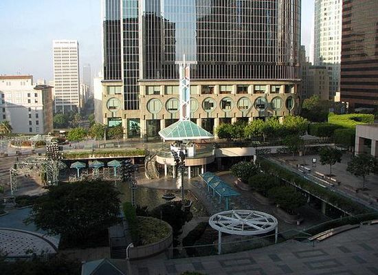 1.200 millones de dólares fue lo que costó el proyecto. Iniciada en 1983, la Two California Plaza se completó en 1992, durante una caída significativa del mercado inmobiliario en el centro de Los Ángeles. La torre se abrió con sólo el 30% por ciento de su espacio arrendado cuando la tasa global de vacantes en el espacio de oficinas del centro se acercaba a 25%. Fue unos 10 años antes de de que edificios altos se completaran de nuevo en el centro de Los Ángeles. California Plaza fue planeada originalmente para incluir 3 edificios altos.