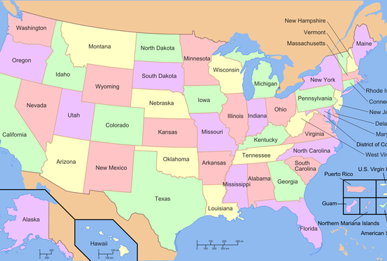 Estados Unidos es el segundo país más grande del continente americano, después de Canadá, y el cuarto del mundo, superado por Rusia, Canadá y China. Situado en la franja central de Norteamérica, se extiende desde la costa atlántica hasta la costa del Pacífico. Al norte comparte con Canadá la frontera desarmada más larga del mundo y al sur limita con México. Está formado por 48 estados contiguos, más Alaska, en el noroeste, y las islas Hawái, en el Pacífico.[2] Las principales unidades de relieve de Estados Unidos son el sistema de los montes Apalaches, el sistema occidental y las llanuras interiores.
