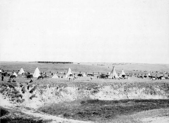 La masacre de Wounded Knee sucedió el 29 de diciembre de 1890,[2] cerca del arroyo Wounded Knee en la reserva india de Pine Ridge, ubicada en el estado estadounidense de Dakota del Sur. El día anterior, un destacamento del 7.º Regimiento de Caballería comandado por el mayor Samuel Whitside interceptó al grupo de indígenas lakota del jefe Si Tanka cerca del pico Porcupine Butte y lo escoltó durante ocho kilómetros hasta el arroyo Wounded Knee, donde acamparon. Allí llegó poco después el resto del 7.º Regimiento de Caballería, liderado por el coronel James W. Forsyth, y rodearon el campamento indígena armados con 4 cañones Hotchkiss.[3]