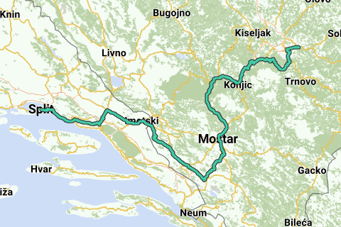 Pelgrimroute pour vélos de course entre Sarajevo et Split. Les villes suivantes se trouvent sur la route : Sarajevo, Mostar, Medugorje et Split.